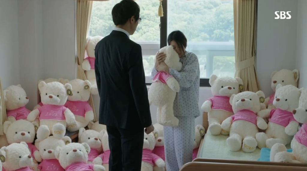 We get our first look at Hoon’s missing mom in this episode. She’s alive, but clearly not in her right mind. Secretary Kim is seen visiting her, with a giant teddy bear in tow. Her room is completely filled with identical stuffed bears. She hugs the bear tightly asking “Hoon, is that you?”