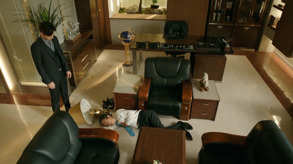 Chairman Oh finally collapses at Jae Joon’s feet. The episode ends with Jae Joon staring down at Chairman Oh’s still form.